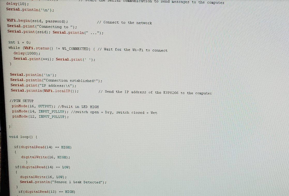 The critical part: the alarm logic runs entirely on the ESP8266 itself. When water is detected, the red LED turns on, the buzzer pulses at 0.5 second intervals, and the alarm continues until all sensors read dry. None of this requires WiFi, internet, or any external service.