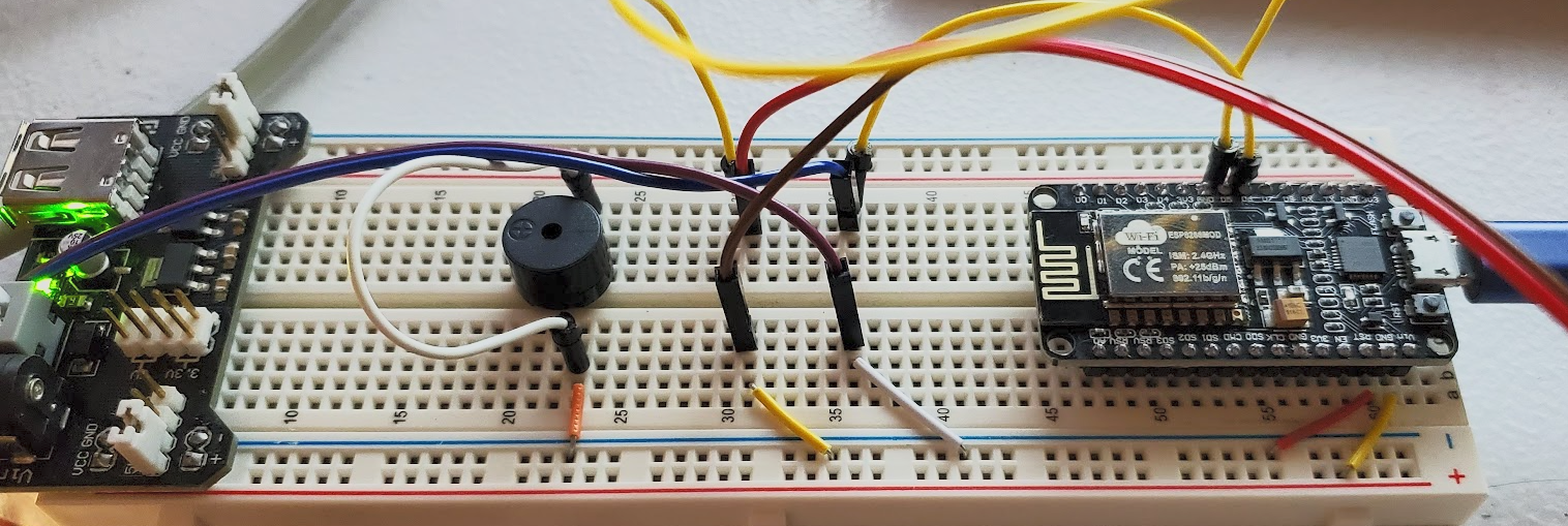 Initial breadboard (November 25, 2020): Basic proof of concept with NodeMCU, power supply module, and minimal wiring.