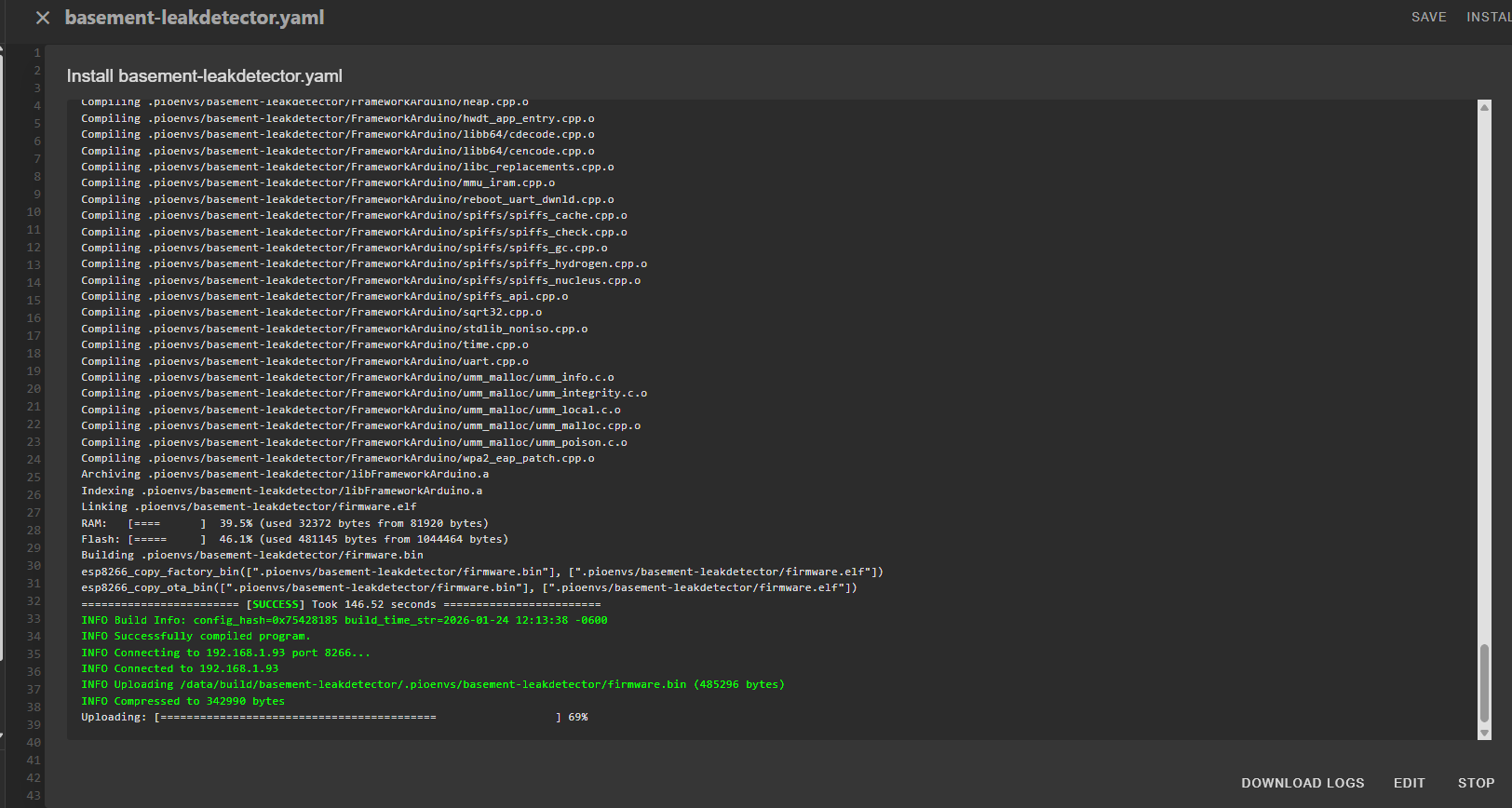 More importantly, ESPHome supports over-the-air (OTA) firmware updates. I can modify the configuration from my laptop, recompile, and push updates wirelessly. No more trips to the basement with a laptop and USB cable.