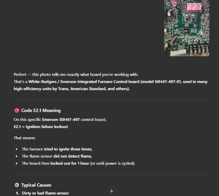 I pulled up ChatGPT and started typing: "I have a high efficiency gas furnace. I don't think it's lighting properly. I see the screen in the furnace flashing tps, e2.1, Ht"