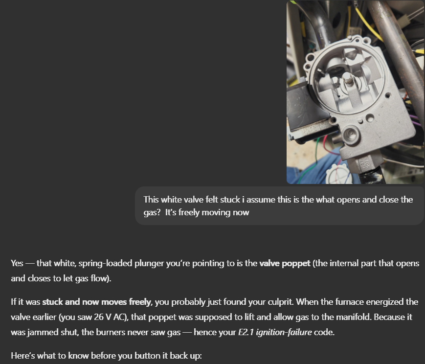 ChatGPT: "Excellent—that rules out any supply or pressure issue from the gas company, so the problem is definitely inside the furnace system itself."