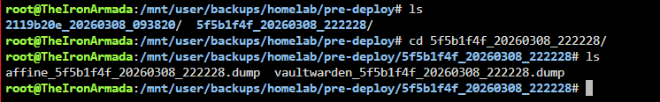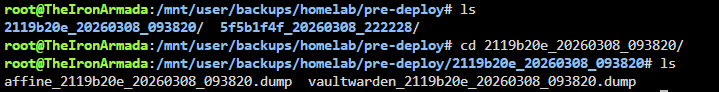 Before any deployment that touches a stateful service, the pipeline runs a backup job first. For Postgres services it connects directly from the runner to TheIronArmada's Postgres instance, runs pg_dump in custom format, and SCPs the dump across. For SQLite services it SSHes into the monitor LXC and uses docker cp to pull the database files out of the running containers. Everything lands at /mnt/user/backups/homelab/pre-deploy/ on TheIronArmada, tagged with the commit SHA so each backup is traceable back to the exact git state it preceded.