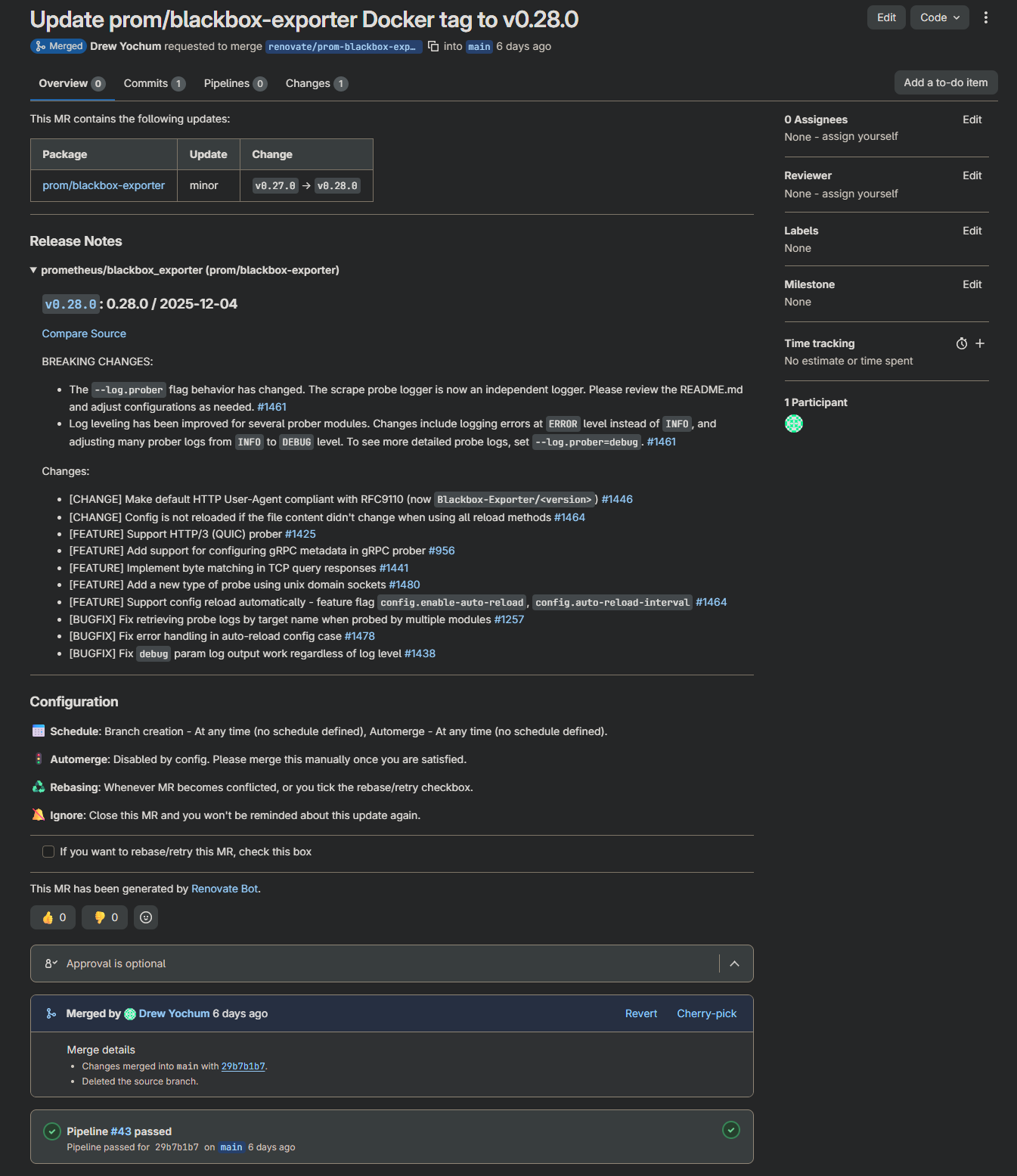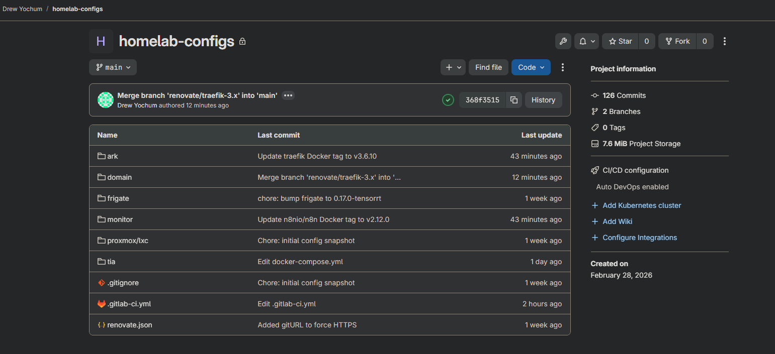 I set up Renovate Bot against the repository. It scans my docker-compose.yml files, compares pinned image tags against Docker Hub and GHCR, and opens MRs for anything out of date on a schedule. No more "I wonder if that image has updates." Renovate just tells me, with a ready-to-merge MR attached.