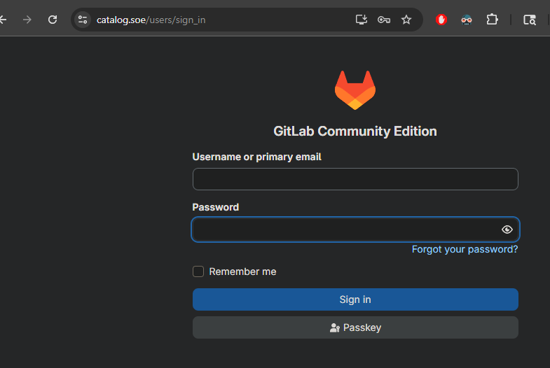 Once it had what it needed, GitLab came up at catalog.soe on my internal .soe domain, served through Traefik with TLS certificates from my internal Step-CA. HTTPS, internal domain, trusted cert. It looks like actual infrastructure.