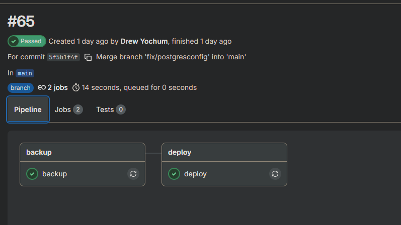 The backup stage only runs when the relevant Compose files actually changed, so it's not firing on every single push. And critically, if Postgres isn't reachable when the backup job runs, the pipeline stops completely. Nothing deploys until there's a verified restore point.
