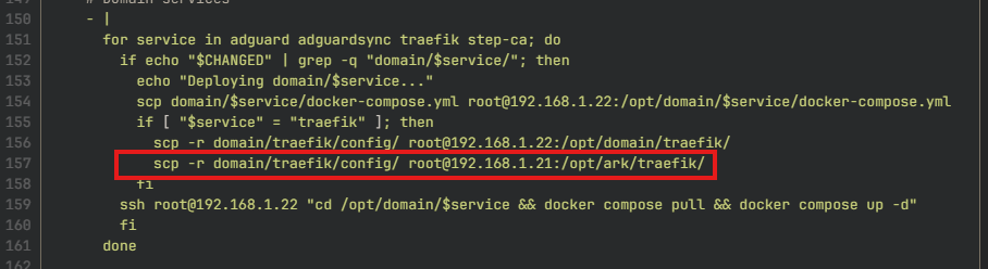 The interesting part is the Traefik config sync. The Ark doesn't have its own Traefik configuration. It mirrors Domain's config exactly, which is the whole point. So whenever domain/traefik changes in the repo, the pipeline pushes the config to both Domain and The Ark in the same deploy job: