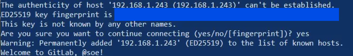 [Screenshot: SSH clone working, GitLab welcome message]