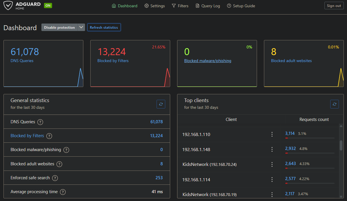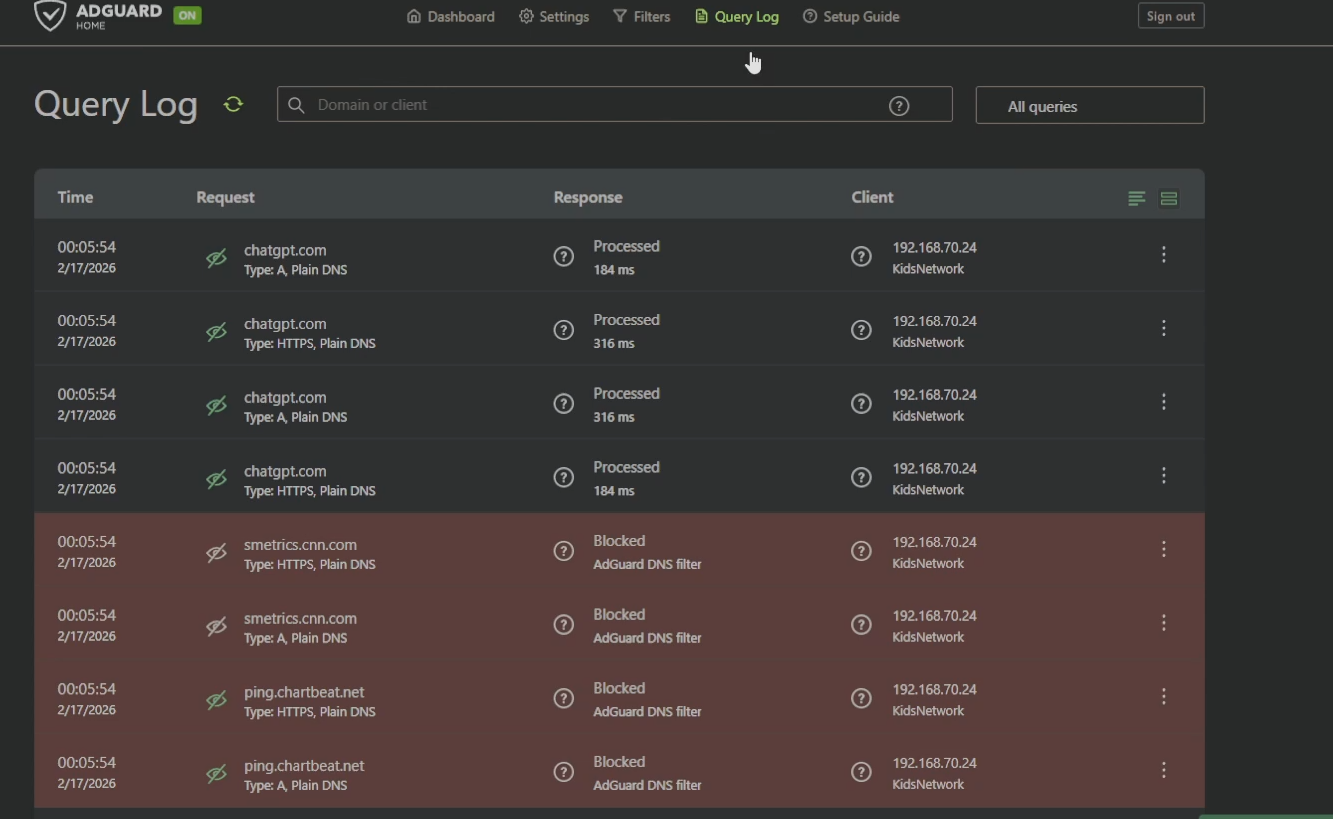 My kids are on a separate VLAN (192.168.70.x) with AdGuard Home handling content filtering. At least, that's what I thought. When I started this project, I spun up a fresh AdGuard instance on a Proxmox LXC and tested it. Main network queries: logged and filtered, no problem. Kids network: queries were getting responses, but nothing was showing up in the query log, and ads.google.com was returning a real IP instead of being blocked.