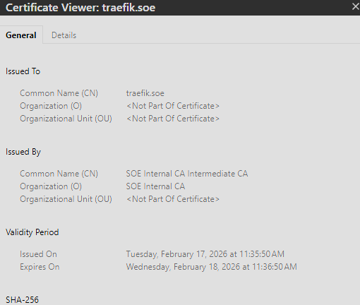 systemctl restart dockerRestart all your containers after this. Once the containers were using the VIP for DNS and could resolve .soe addresses, the ACME challenge succeeded immediately and certs started flowing: