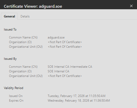 https://adguard.soe- AdGuard Home dashboard, green padlock ✓https://traefik.soe- Traefik dashboard(basic auth protected),green padlock ✓https://proxmox.soe- Proxmox web UI, green padlock ✓