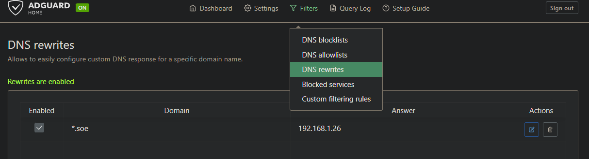 Then add a wildcard DNS rewrite in AdGuard: *.soe → 192.168.1.26. Every .soe hostname now resolves to the Traefik VIP automatically. Adding a new service to Traefik's dynamic config is all you need; no DNS entry to manage.